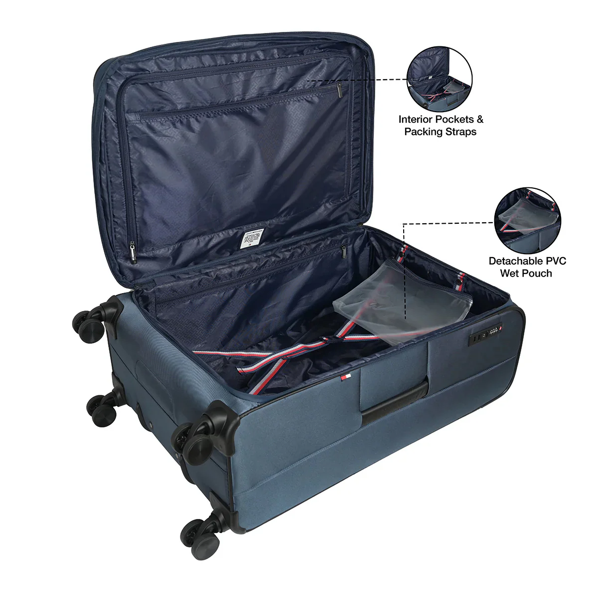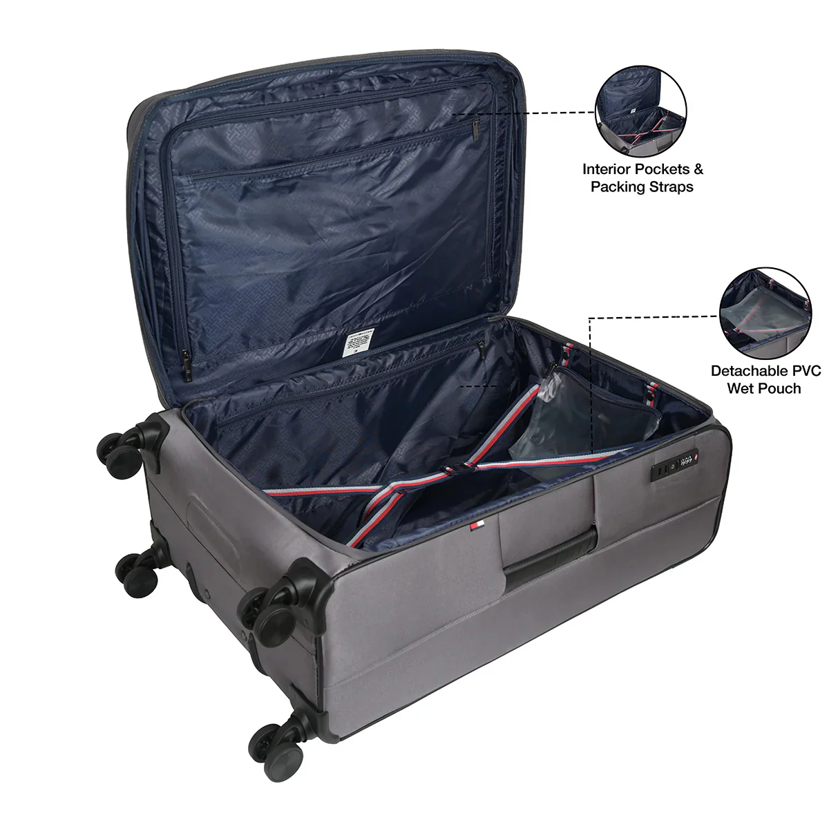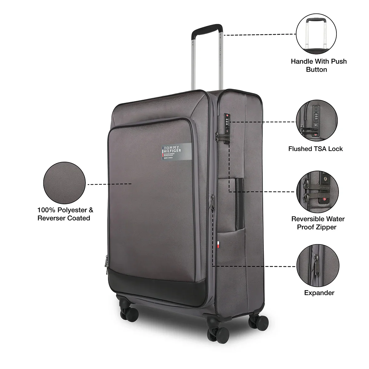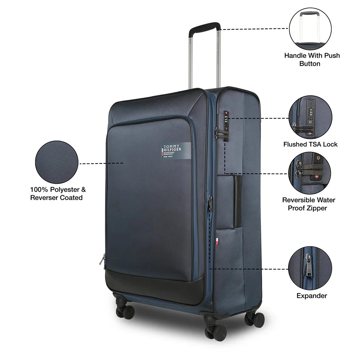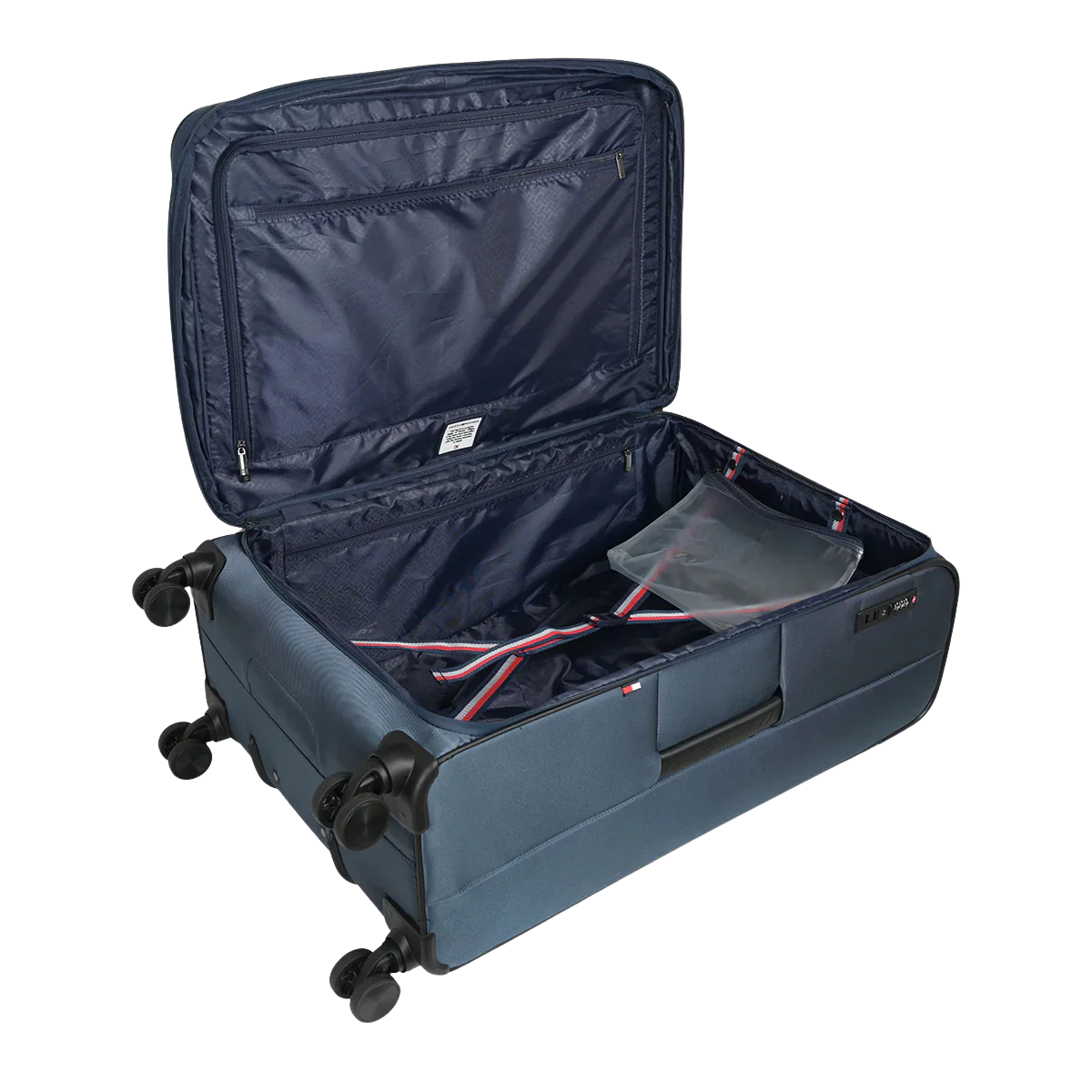 ravel in signature style with the Tommy Hilfiger Westfield Soft Luggage Collection, where fashion meets functionality for today’s modern traveler. Crafted from 100% reversed coated polyester, this premium luggage offers enhanced durability and a sleek finish, protecting your belongings from the everyday rigors of travel. Whether you’re heading for a weekend getaway, a week-long trip, or an extended vacation, the Westfield series is designed to adapt seamlessly to your journey.